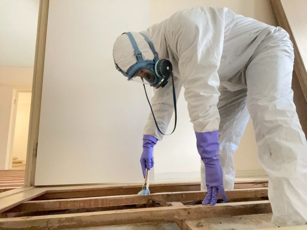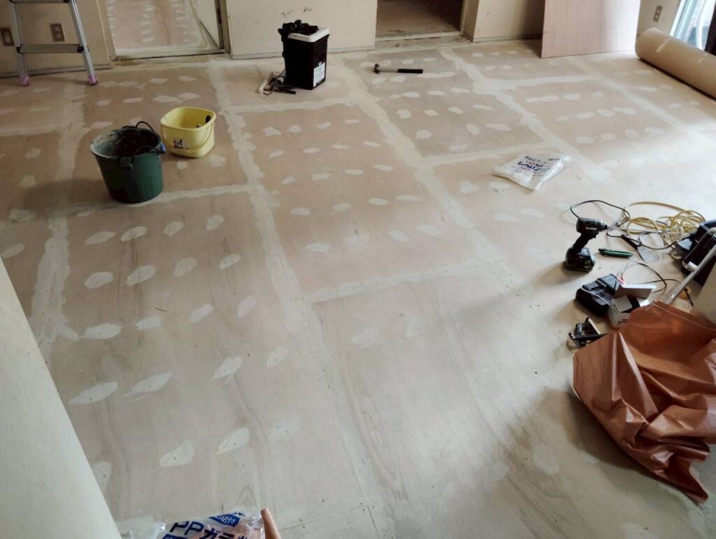2026.02.15 水漏れによる床の復旧工事 施工事例 名古屋市高岡にて、マンションの水漏れが原因で傷んでしまった床の復旧工事を行いました。 水漏れ後の床は見た目以上にダメージが進んでいることが多く、今回は安全性と耐久性をしっかり確保するために、床を一度すべて解体するところから作業をスタートしています。 まずは既存の床材を撤去し、内部の下地を丁寧に確認。湿気やカビの発生を防ぐため、下地全体をしっかりと消毒処理しました。その後、新しいベニヤ板を貼り直し、仕上げとしてクッションフロアを施工。見た目も清潔感があり、快適な仕上がりになりました。