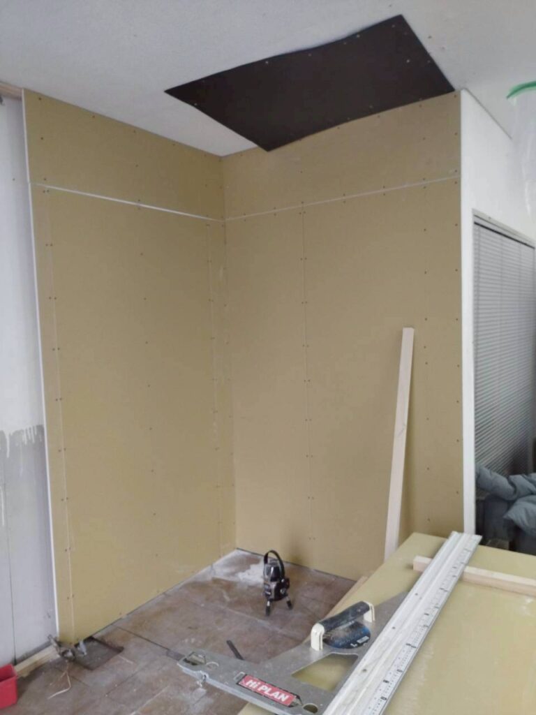 今回の施工では、パテ練習で傷みやすいプラスターボードを簡単に交換できる構造にすることをポイントに施工しました。