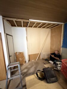 そこにプラスターボードや薄ベニヤで、壁紙を貼る下地を作りまして、見にくいですフローリングを施工して